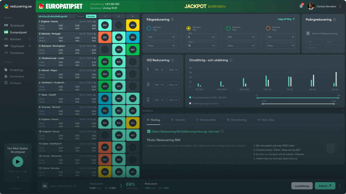 Spela Europatipset på ett smartare och bättre sätt med hjälp av Sveriges vassaste reduceringsverkyg, framtaget av erfarna spelexperter med syfte att göra det enklare att vinna på Europatipset. Helt gratis att använda!